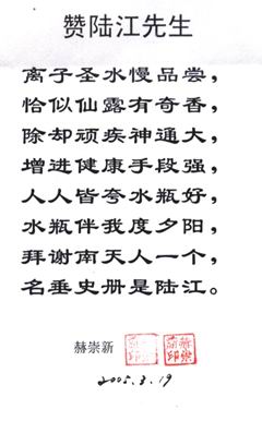 3. 詳細(xì)了解請上網(wǎng),可見臨床報告,鑒定證書、專家評說、治病機(jī)理、用戶反饋、題詞、詩歌、錦旗等彩色掃描件,被譽(yù)為"神奇水瓶"。