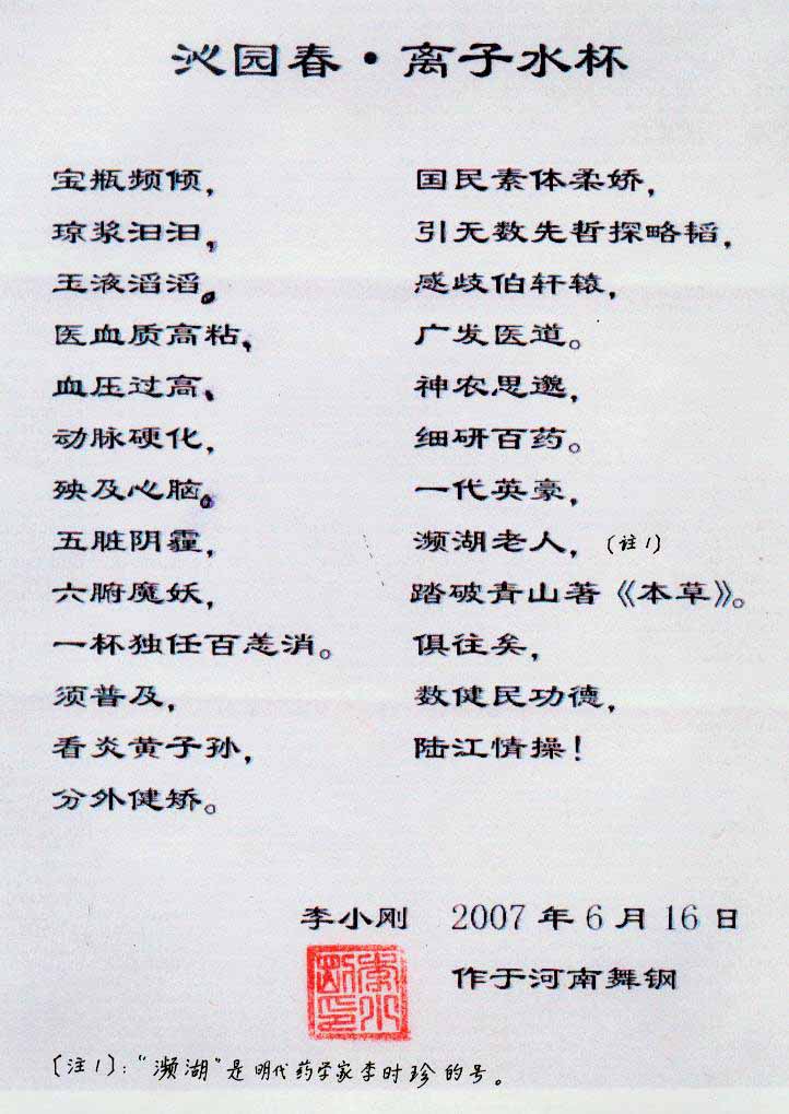 -----我是從事建筑的高工,本來沒有資格去攻克醫(yī)學(xué)難題,卻為了自身健康才扣響醫(yī)學(xué)的大門。由于我1990年患高血壓,因怕中風(fēng)才研究發(fā)明了離子水瓶,我把水處理成微小分子團(tuán)水,飲用后治愈了高血壓。便于1993年底送到三家省級醫(yī)院做臨床試用4個月。經(jīng)北京和廣西醫(yī)學(xué)專家鑒定:"降脂降壓效果好"," 能擴(kuò)大心腦動脈流量,改善心腦電圖以及微循環(huán)","對治療心腦動脈粥樣硬化、高血壓、高血脂有良好的醫(yī)療保健作用。""產(chǎn)品的技術(shù)性能和療效達(dá)到了同類產(chǎn)品的國內(nèi)領(lǐng)先水平,經(jīng)廣西醫(yī)學(xué)科學(xué)情報研究所檢索,未見國外有類似報道。"中國醫(yī)學(xué)科學(xué)院張正國教授從美國國立醫(yī)學(xué)圖書館數(shù)據(jù)庫存Medline檢索英俄文資料,均未見類似報告。2000年上市后,我為了對消費(fèi)者負(fù)責(zé)而繼續(xù)觀察研究,一直通過《信譽(yù)卡》和《質(zhì)量跟蹤調(diào)查書》向患者承諾療效,請用戶使用6個月后反饋效果。和脂壓患者飲用2至5個月內(nèi),消除癥狀,停服藥物,血壓正常;冠心病患者飲用3~5個月逐漸減輕至消除心絞痛、房顫等癥狀,不再服藥,飲用1年左右心電圖正常,經(jīng)冠脈造影掃描無明顯狹窄,表明冠心病痊愈。大量患者還反映許多衰弱器官被修復(fù),讓前列腺增生、慢性咽喉炎、慢性氣管炎、支氣管炎、慢性胃炎、腸炎和膽囊炎等不藥而愈;2型糖尿病患者是因為胰島衰弱致病,飲用該水半年至一年,逐漸減藥至停藥,血糖尿糖正常,真正治愈2型糖尿病。中風(fēng)后遺癥患者飲用六七個月,可逐漸減輕至消除肢體和語言障礙,表明飲用該水能讓壽命很長的神經(jīng)元細(xì)胞逐漸修復(fù),奇跡般地恢復(fù)肢體和語言功能。飲用后還使胸腺和脾臟兩個重要的免疫器官被修復(fù)和增強(qiáng),產(chǎn)生免疫細(xì)胞多,提高了免疫力,使人不生病或少生病。自此, 飲用微小分子團(tuán)水創(chuàng)造了攻克冠心病、高(低)血壓和糖尿病三大醫(yī)學(xué)難題的奇跡。人們對此感到不可思議,但實踐是檢驗真理的唯一標(biāo)準(zhǔn)。
